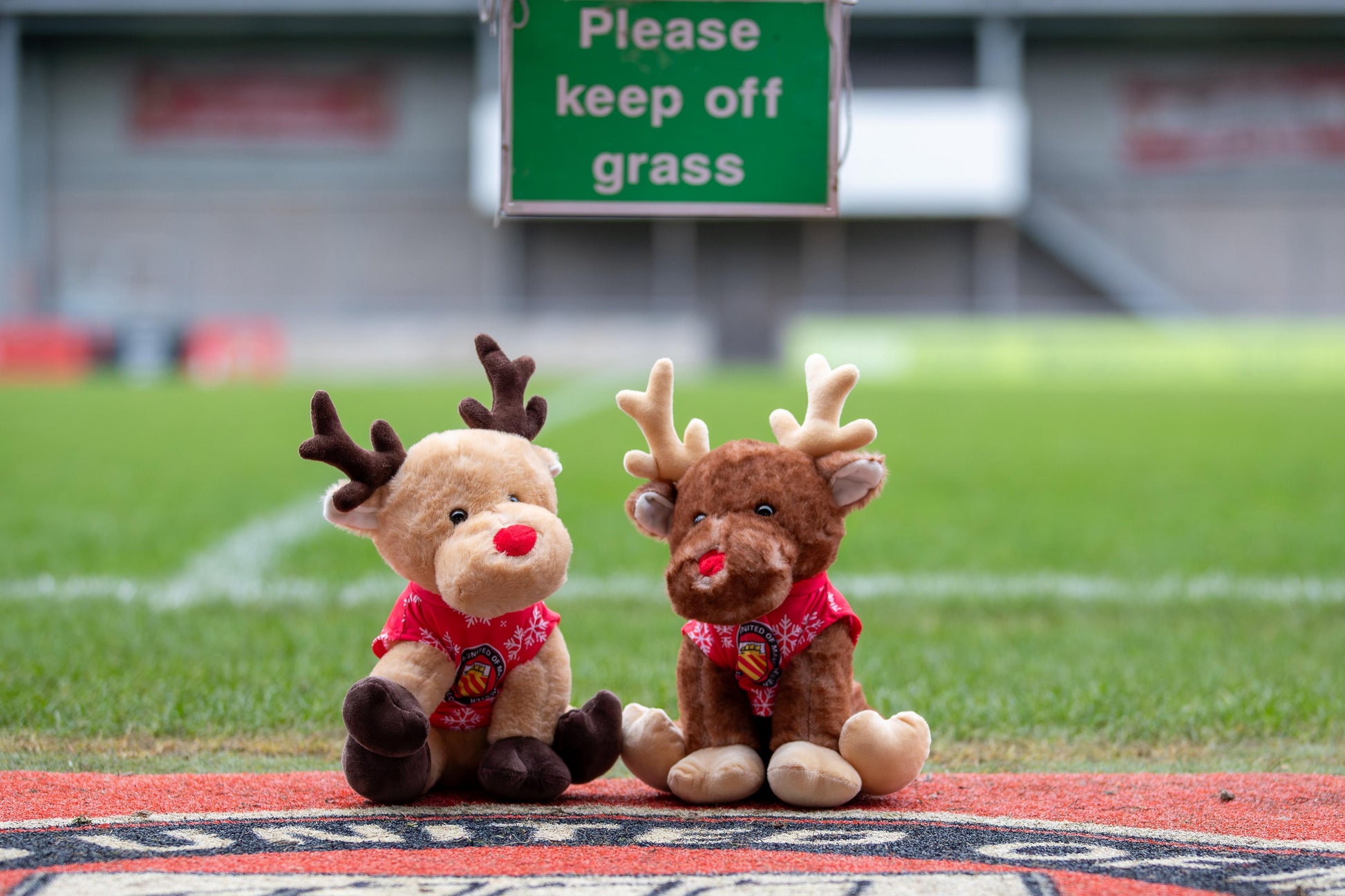 Especially for the Christmas season, a choice of two reindeer toys; one beige with dark antlers and hooves, the other brown with light antlers and hooves. Both with a red nose and wearing an FC Utd Christmas top.
