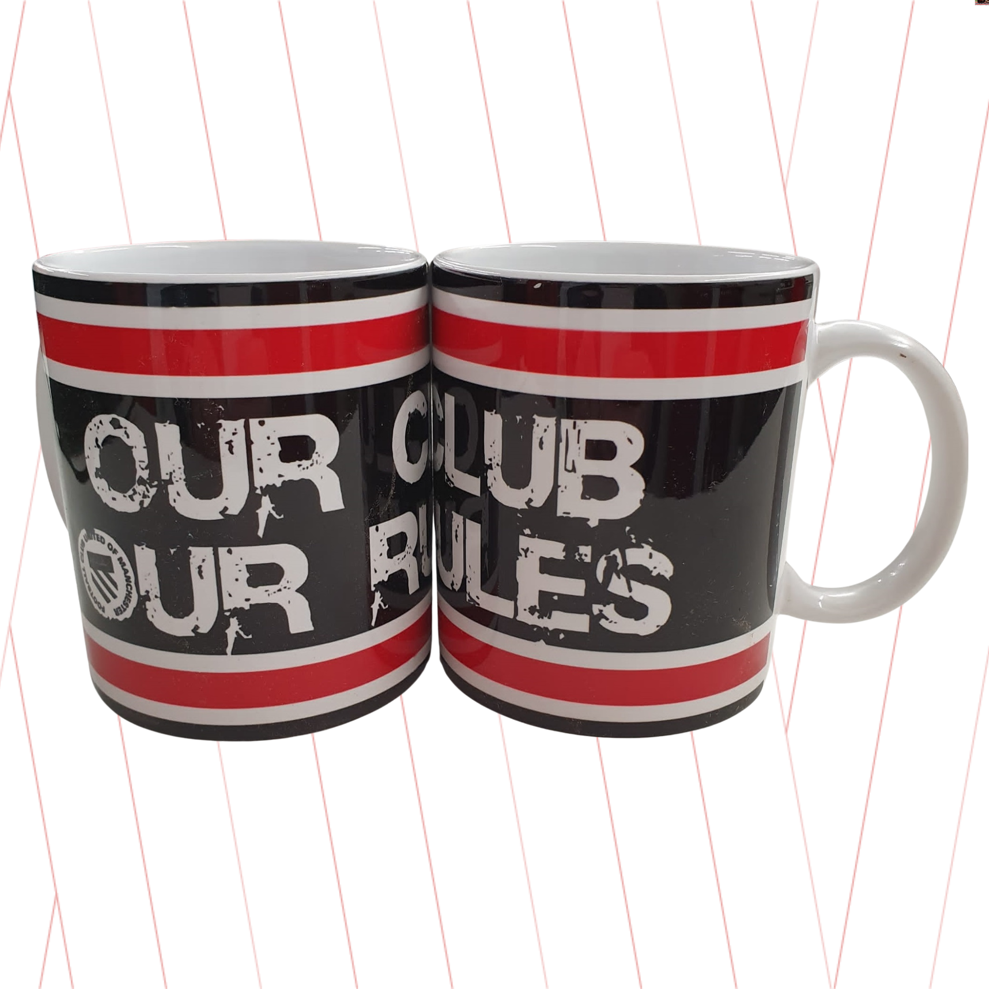 Mug with black and red design featuring the 'Our Club Our Rules' motto.