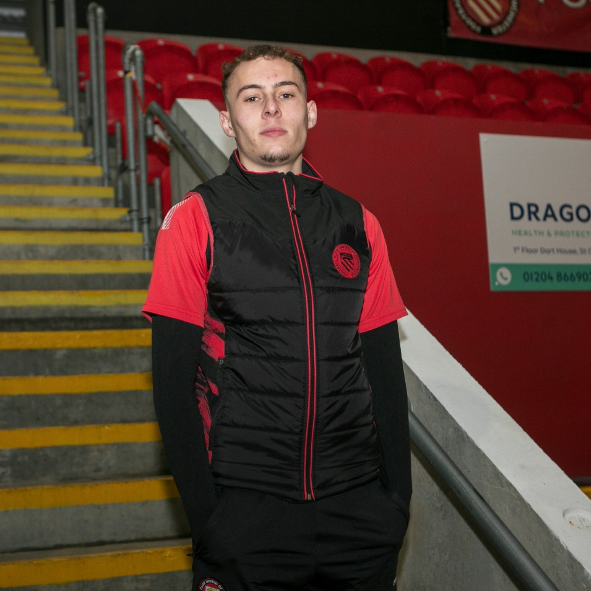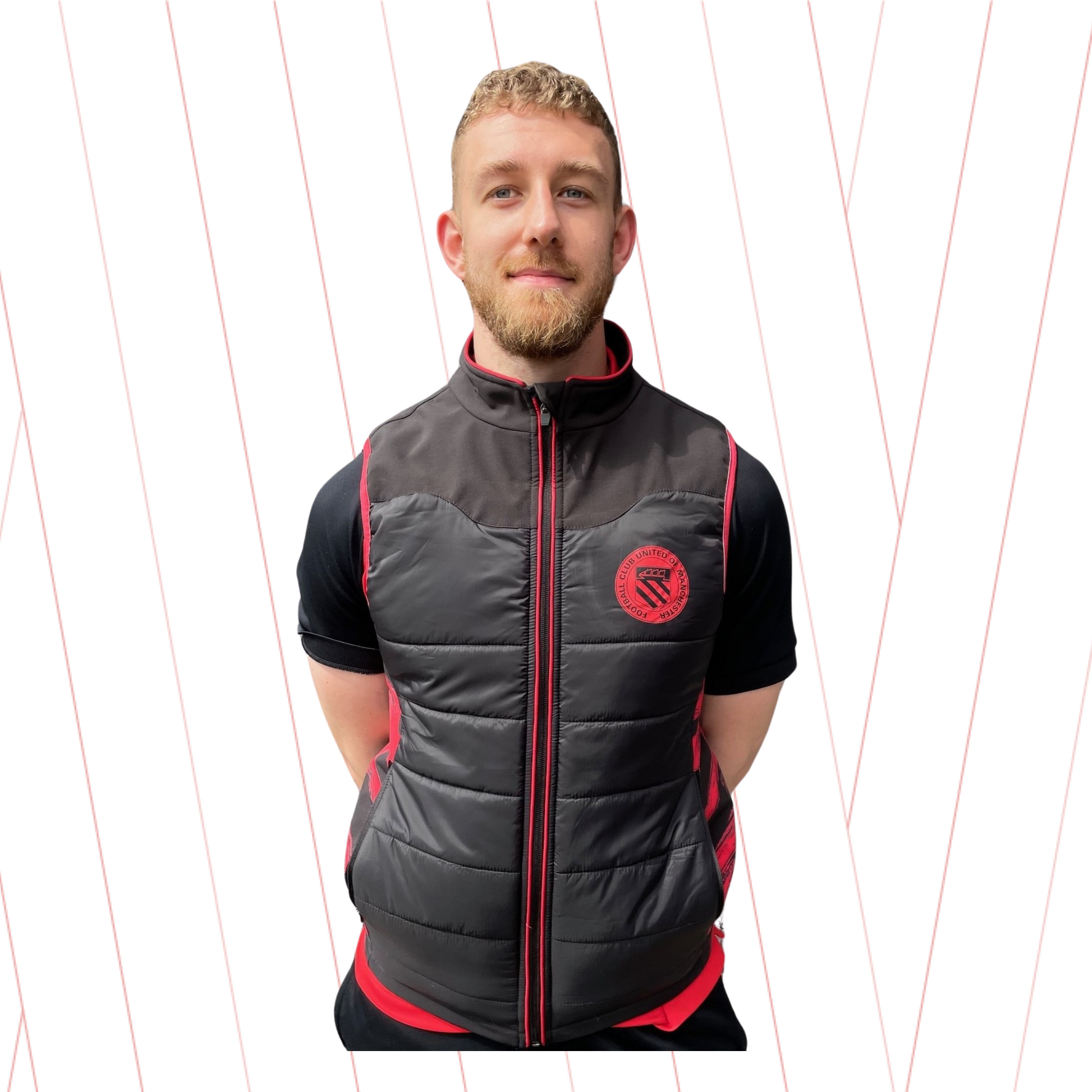 Padded light weight gilet with trim, side panels and club crest in red.