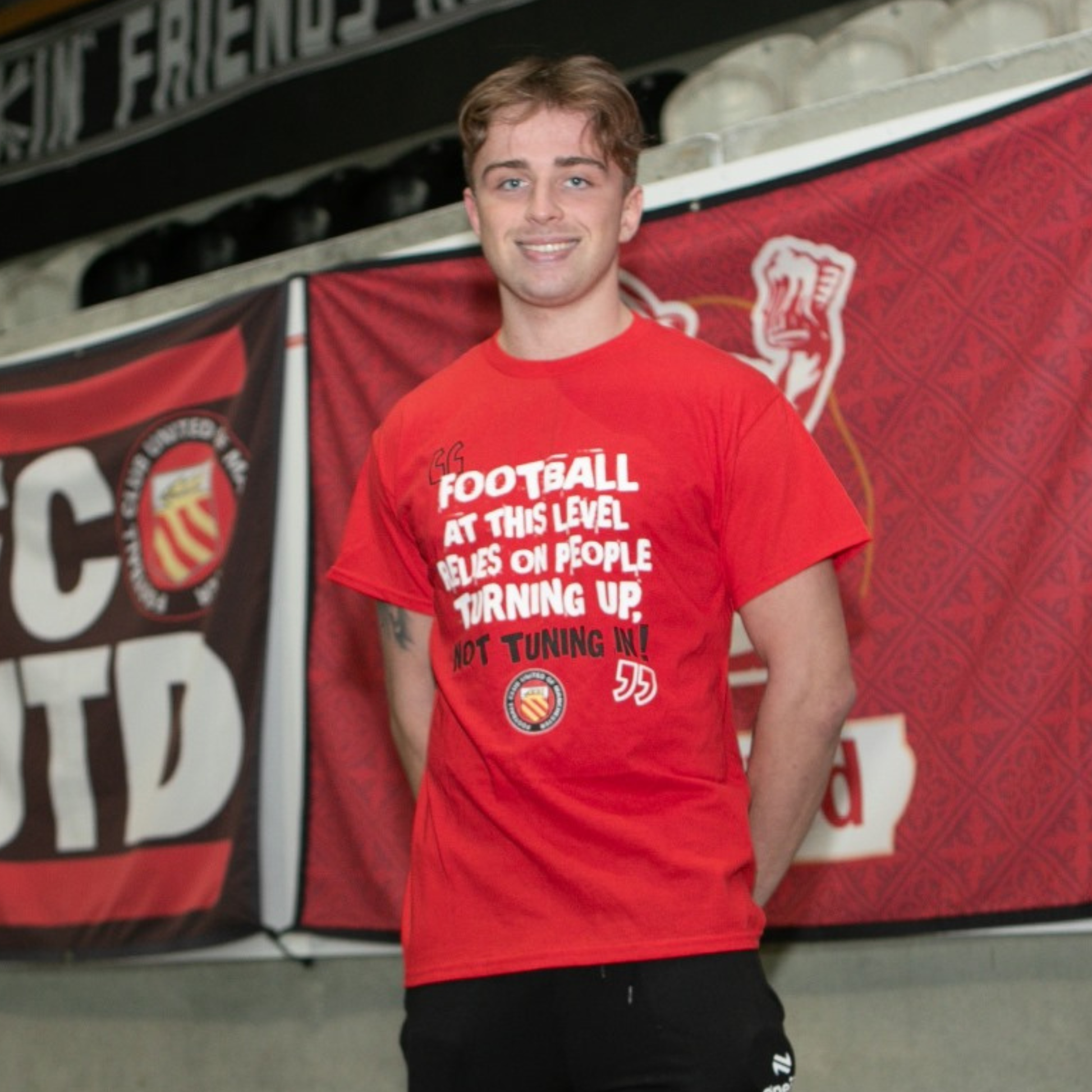 Red T-Shirt bearing the quote 'Football at this level relies on people turning up, not tuning in' above the club crest.